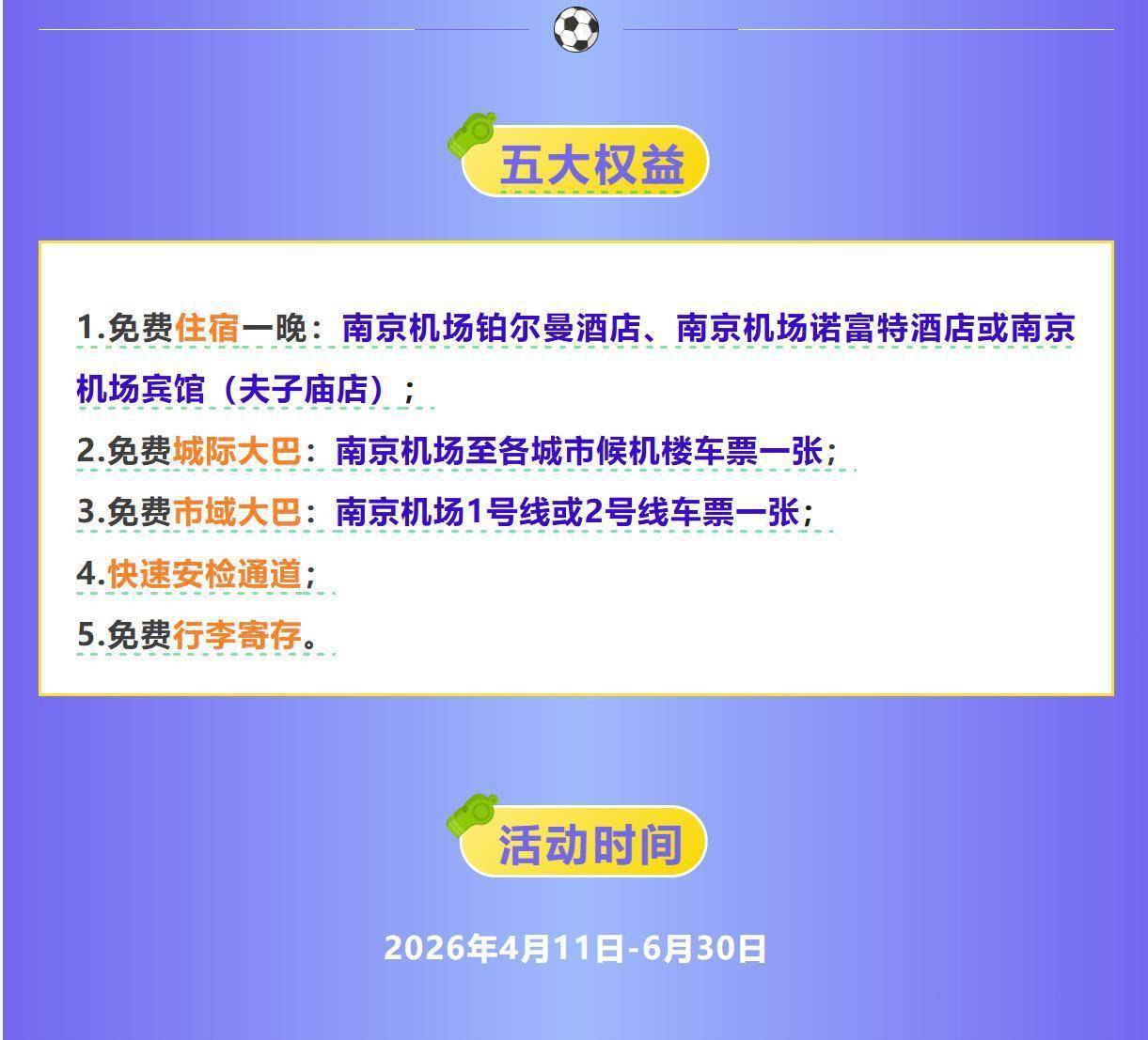 据南京禄口海外机场推文,2026年苏超联赛火热来袭,外省球迷得胜购买大肆一场苏超球赛门票,并搭乘航班抵达南京机场,无需独特糜掷,即可凭灵验字据享受五项职权:免费住宿一晚、免费城际大巴、免费市域大巴、快速安检通说念、免费行李寄存。