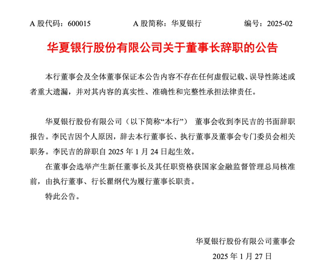 1月27日,中原银行(600015)发布公告称,董事会收到李民吉的书面去职禀报。李民吉因个东说念主原因,辞去该行董事长、履行董事及董事会特意委员会有关职务。李民吉的去职自2025年1月24日起见效。