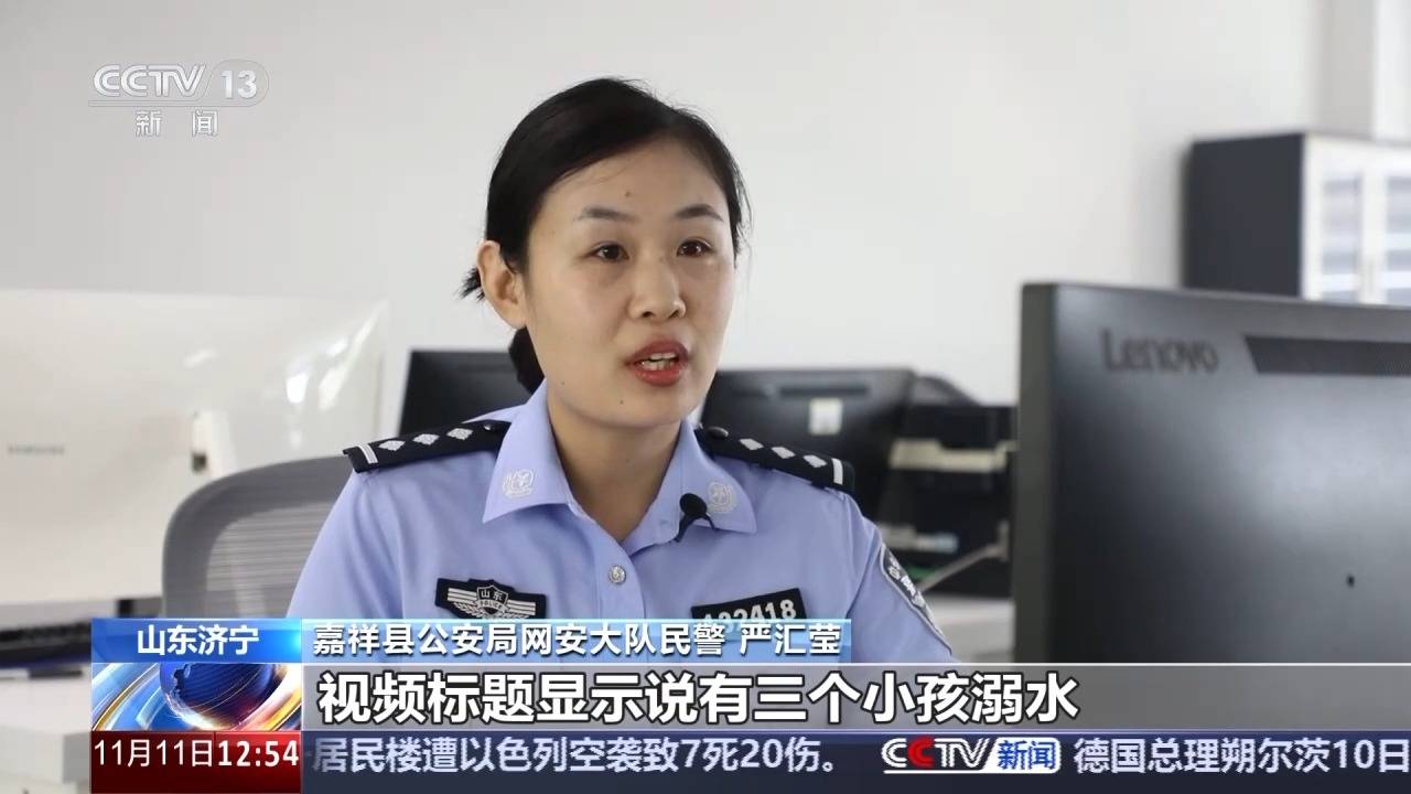 嘉祥县公安局网安大队民警 严汇莹:视频标题表露说有三个小孩溺水,视频中内容有大齐环球在一闸口上进行围不雅,多名须眉在闸上进行拉渔网的算作。