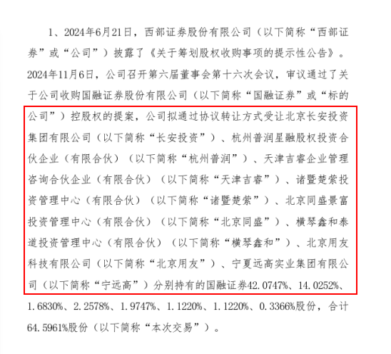 让西部证券置身千亿俱乐部的,是一笔正在进行的并购——2024年11月,西部证券晓谕,将花费38.25亿元,收购国融证券11.51亿股股份(占总股本比例64.59%)。
