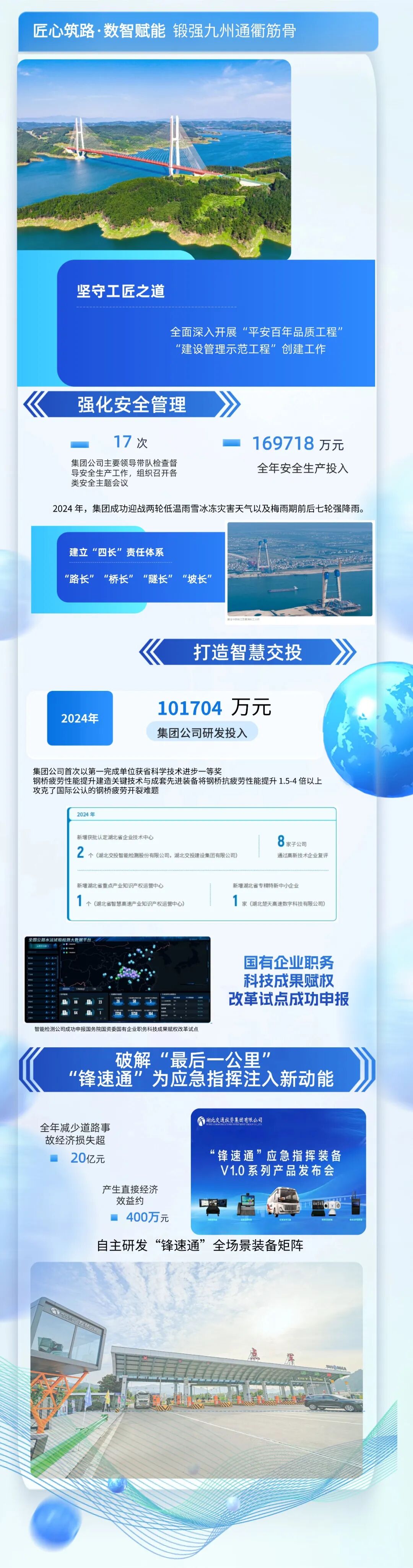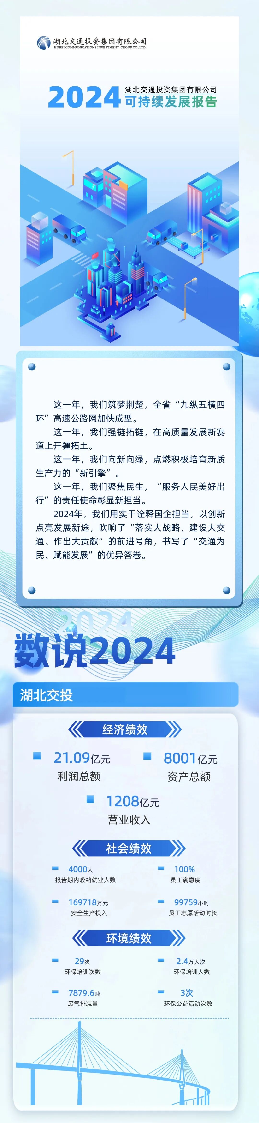 2024年,湖北交投集团顽强贯彻省委省政府有策画部署,弥远信守“做事东谈主民环球好意思好出行”的初心职责,充分进展交通基础次序开荒主力军作用,完成交通基础次序投资925亿元,终了贸易收入1208亿元,利润总数21.09亿元,财富鸿沟冲破8001亿元。建成了宇宙首条汉宜高速氢能重卡示范线、全省首条汉十抽象动力示范线,全力激动武汉齐市圈京港澳、武黄高速等要紧改扩建工程,全年建成高速公路195公里,助力全省高速公路总里程冲破8000公里。集团公司一语气四年踏进中国企业500强,在2025年榜单中位列第222位,在2024年“湖北企业100强”中稳居第8位,抽象实力和社会影响力抓续耕种。