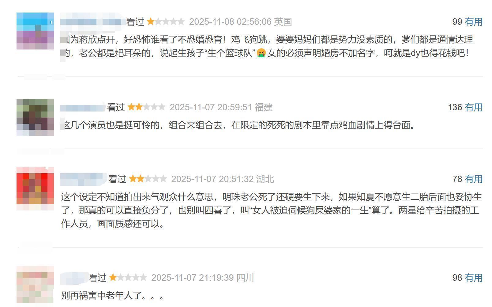 刚开播就骂声一派!央八力挺却差评如潮,一级演员被指“戏混子” 《四喜》没播的时辰,公共王人合计它详情是年度爆款没跑了!演员全是眼熟的实力派,导演和编剧王人是业内公认的好坏变装,背后还有央视和腾讯两大平台撑腰,不雅众王人盼着能看到一部不炒流量、不搞噱头的好剧。 后果开播没几集,评分就一齐往下掉,差评和争议全涌了过来。剧情被吐槽又狗血又险恶,连许娣这种国度一级演员王人被不雅众骂 “戏混子”,真的太让东说念主不测了!开篇剧情几乎密集到窒息,女主沈明珠刚孕珠还千里浸在新婚粗豪里,丈夫片刻就没了。这边悲哀还没消化完,亲生父母拿着 DNA 找上门认亲,养父母拚命拆开,婆婆催着喝保胎药,借主还堵在门口要钱。短短三集,把丧夫、认亲、逼生、还债这些戏码全堆在一齐,不雅众看得跟坐过山车似的,喘不外气。
