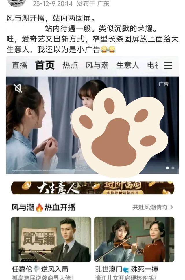 就是说,别的央视剧集首日非会员统计2个半小时,《风与潮》唯有2个小时。 此外,四肢新上的大剧,平台每每给到的固屏是4个,《风与潮》唯有2个。