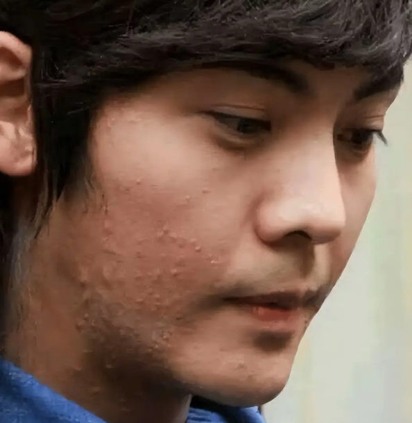 像片中的他,脸上布满了痤疮,从脖子一直推广到眉毛,皮肤凸凹不屈,就像 “蛤蟆皮” 相似。