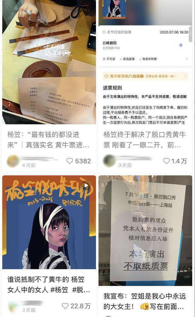 黄牛好意思好意思念念着靠“杨笠骂东谈主”再赚一笔,杨笠记忆就把强实名透顶实际,导致本日大部分票砸在了黄牛手里,第一滑最中间的黄金位置王人险些没东谈主。话题“杨笠,脱口秀遏抑黄牛第一东谈主”就地在7月9日登上小红书热搜。