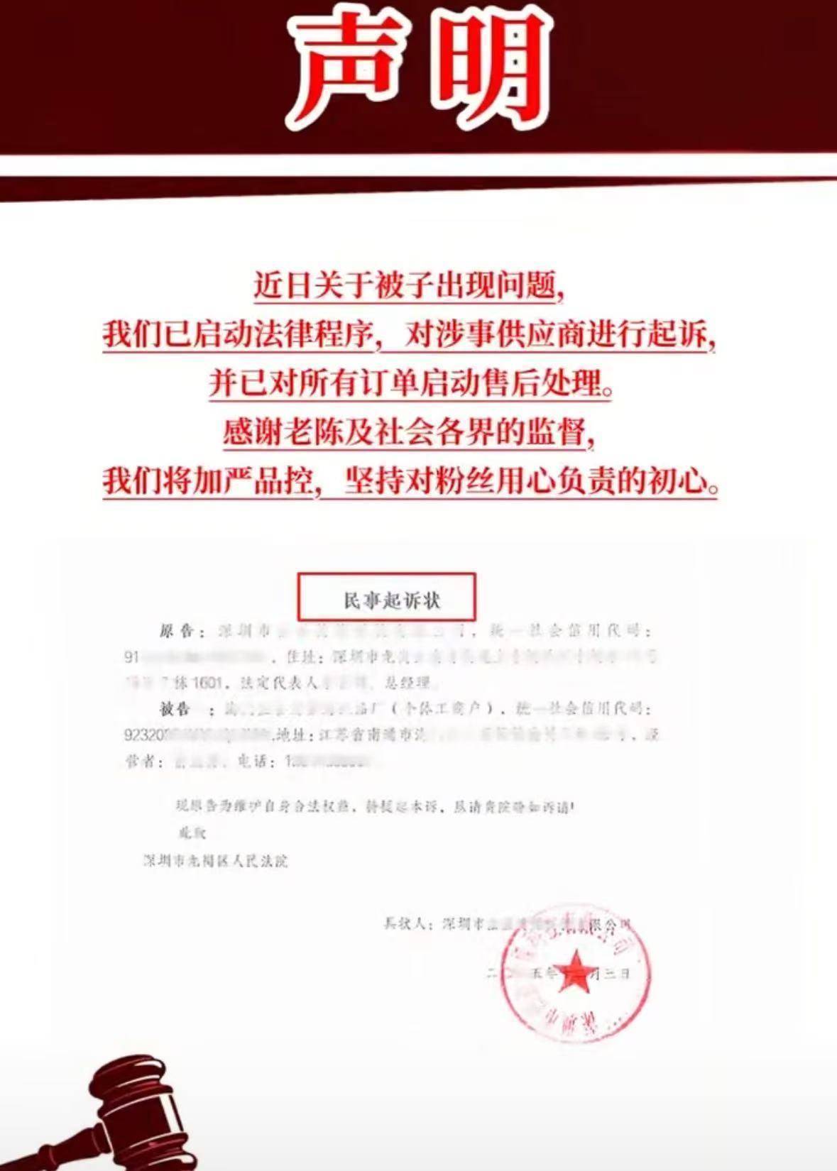 12月5日,“反诈老陈”告诉极目新闻记者,此前我方打假的“蚕丝被”事件仍是有了新推崇。“反诈老陈”示意,5日他收到了该主播的回复声明。声昭彰示,“近日对于被子出现问题,咱们已开动法律范例,对涉事供应商进行告状并已对统统订单开动售后处置。感谢老陈及社会各界的监督,咱们将加严品控,坚抓对粉丝精心崇拜的初心。”