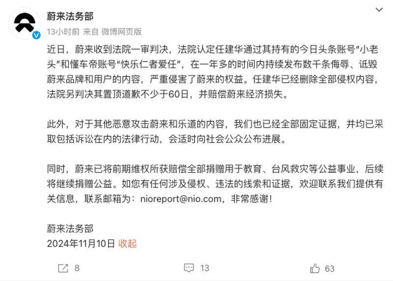 易车讯 日前,蔚来法务部发布公告称:近日,蔚来收到法院一审判决,法院认定任建华通过其握有的本日头条账号“小老翁”,在一年多的时辰内握续发布数千条侮辱、谩骂蔚来品牌和用户的实质,严重侵害了蔚来的权利。任建华照旧删除一说念侵权实质,法院另判决其置顶说念歉不少于60日,并补偿蔚来经济亏损。