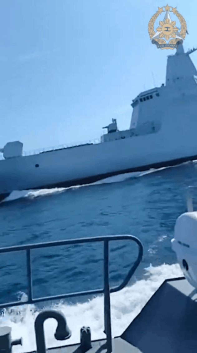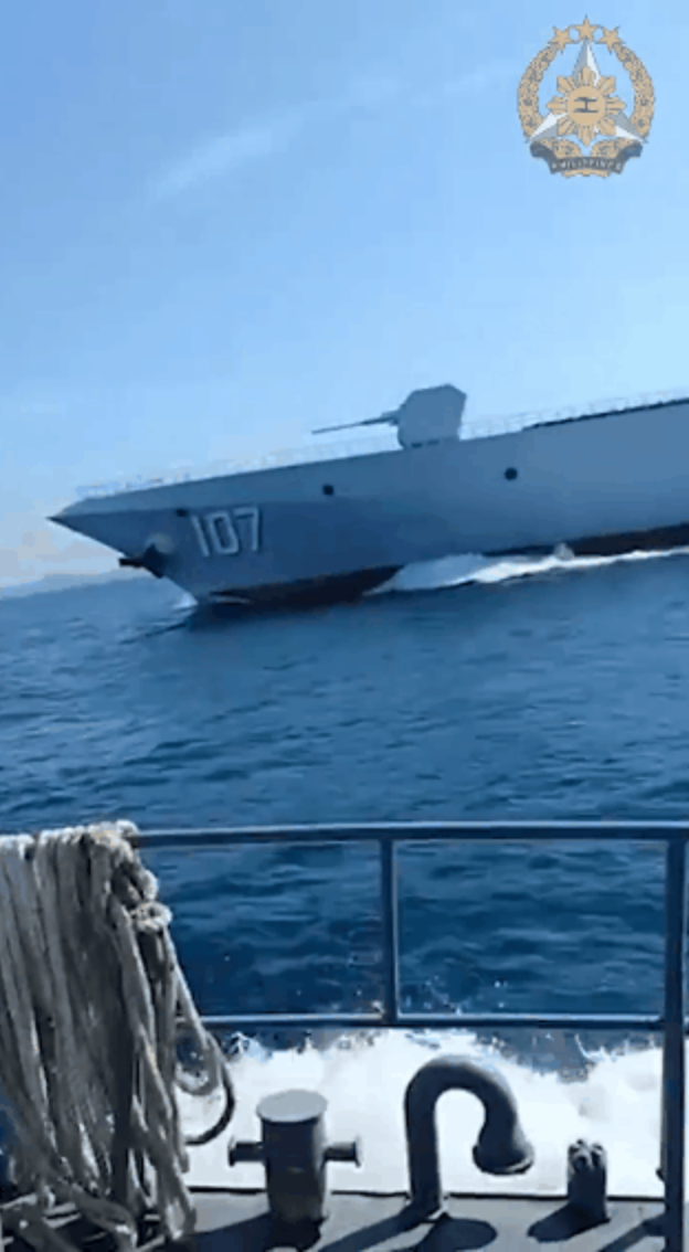 当今,互联网上裸露了一则1′14″短视频,从拍摄者的角度来看,网友能够判断是菲律宾船只上所拍摄。能看到菲律宾海警船只或者是舟师的巡查舰,在中国舟师107“遵义”舰的左舷很近的距离内比肩漂荡。