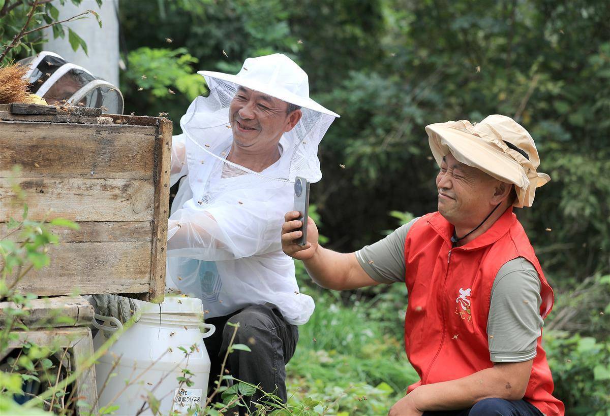 荆门市东宝区栗溪镇三元村的山林间,党员在镜头前向网友推介村民家的纯自然土蜂蜜。(视界网 赵平 章春梅 摄)